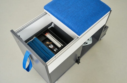 Available in four distinct variations, the Sidekick collection offers the ultimate in personalization. Tabletops on pneumatic lifts create an ancillary workspace, while casters keep things mobile. A tambour cabinet unit features a unique locking tambour door for securing personal items. Two-door and single-door units feature a combination of traditional cabinet and mobile work cart. And the workhorse, adds a sliding padded seat that one straddles like a hobby horse for adults, complete with foot stirrups for added comfort, and a hidden storage space for personal items. Multiple finishes are available for all four types, allowing for branding and personalization.