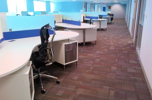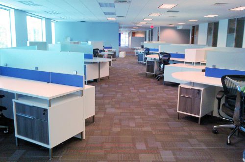 DeskMakers was chosen to furnish office space in Dallas, TX for a company that provides high-tech products for various U.S. industries, namely aerospace, defense, and security. The bold blue keeps this office colorful, while the contrast of the white surfaces and dark drawer fronts keep it looking clean and modern.