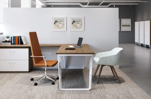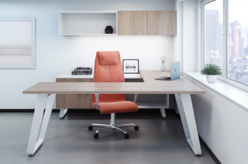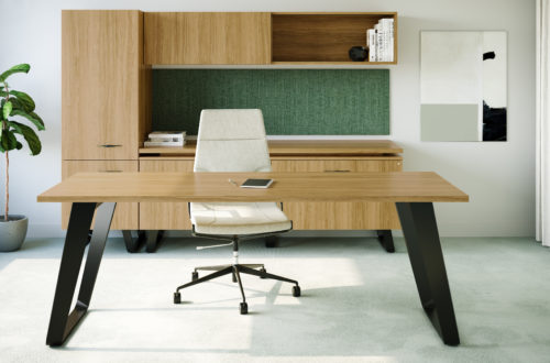 Blending classic features with a mid-century modern twist, Ribbon is anchored by a sleek base that slightly twists and tapers creating a design that plays with angles and perceptions. Loop or hairpin leg options on a variety of workstation configurations are offered with or without storage to suit any number of spaces. Ribbon’s signature design scheme is also translated to other modules of the private office, including curvilinear modesty panels, storage units, and one-of-a-kind handle pulls.