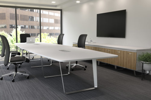 Complementary meeting tables feature Ribbon’s signature leg for design continuity throughout spaces. Round, square and rounded-square table tops are offered in 42”, 48”, 54” and 60” diameter sizes while rectangular, rounded-rectangular and boat-shaped tops are available in sizes starting at 36” x 72” and ranging up to 60” x 240” – further emphasizing Ribbon’s appeal. A variety of power options keep things charged and at the ready, transforming meeting tables into active workspaces.