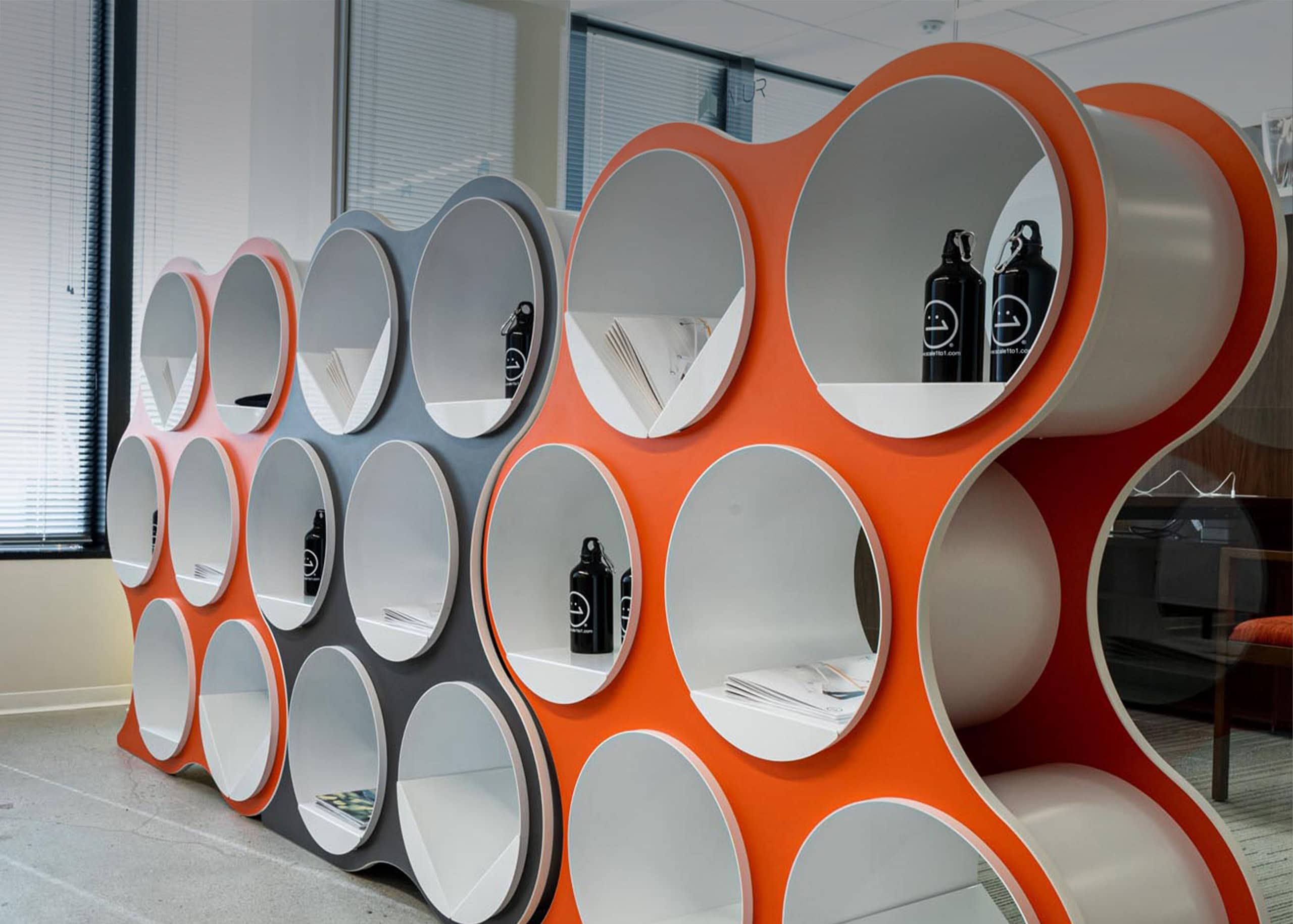 Bolla Storage, designed by David Winston, is an amazing combination of geometry and physics. Inner panels coil into place, and the natural compressive force holds the shelving system together—no tools required. Lightweight yet sturdy, Bolla works as both storage and a room divider, with adjustable, repositionable shelves and extra shelf options for custom configurations. Its bold colors and striking form make it as eye-catching as it is functional.