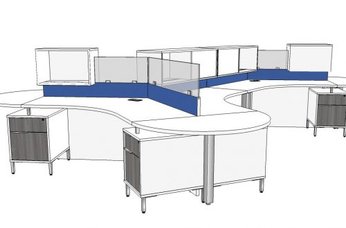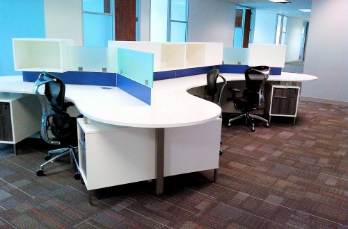 DeskMakers was chosen to furnish office space in Dallas, TX for a company that provides high-tech products for various U.S. industries, namely aerospace, defense, and security. The bold blue keeps this office colorful, while the contrast of the white surfaces and dark drawer fronts keep it looking clean and modern.